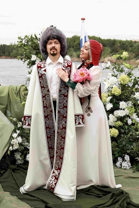 Свадебный костюм и его элементы имеют сакральное значение для жениха и невесты: Роль головного убора невесты – кашмау и нагрудного украшения является неотъемлемой частью свадебного образа. Испокон веков живёт верование защиты от сглаза невесты. Длинные косы невесты прятали под чепец и длинную лопасть, ниспадающую по спине до самых пяток; нагрудное украшение, богато расшитое серебряными монетами, кораллами, бусами, ракушками – каури, считалось не только защитой, но и подчеркивало социальный статус семьи. Мужской свадебный костюм украшался вышивкой – оберегом на воротниках, манжетах и подолах рубахи. Свадебный головной убор мужчин также был богато украшен узорами.